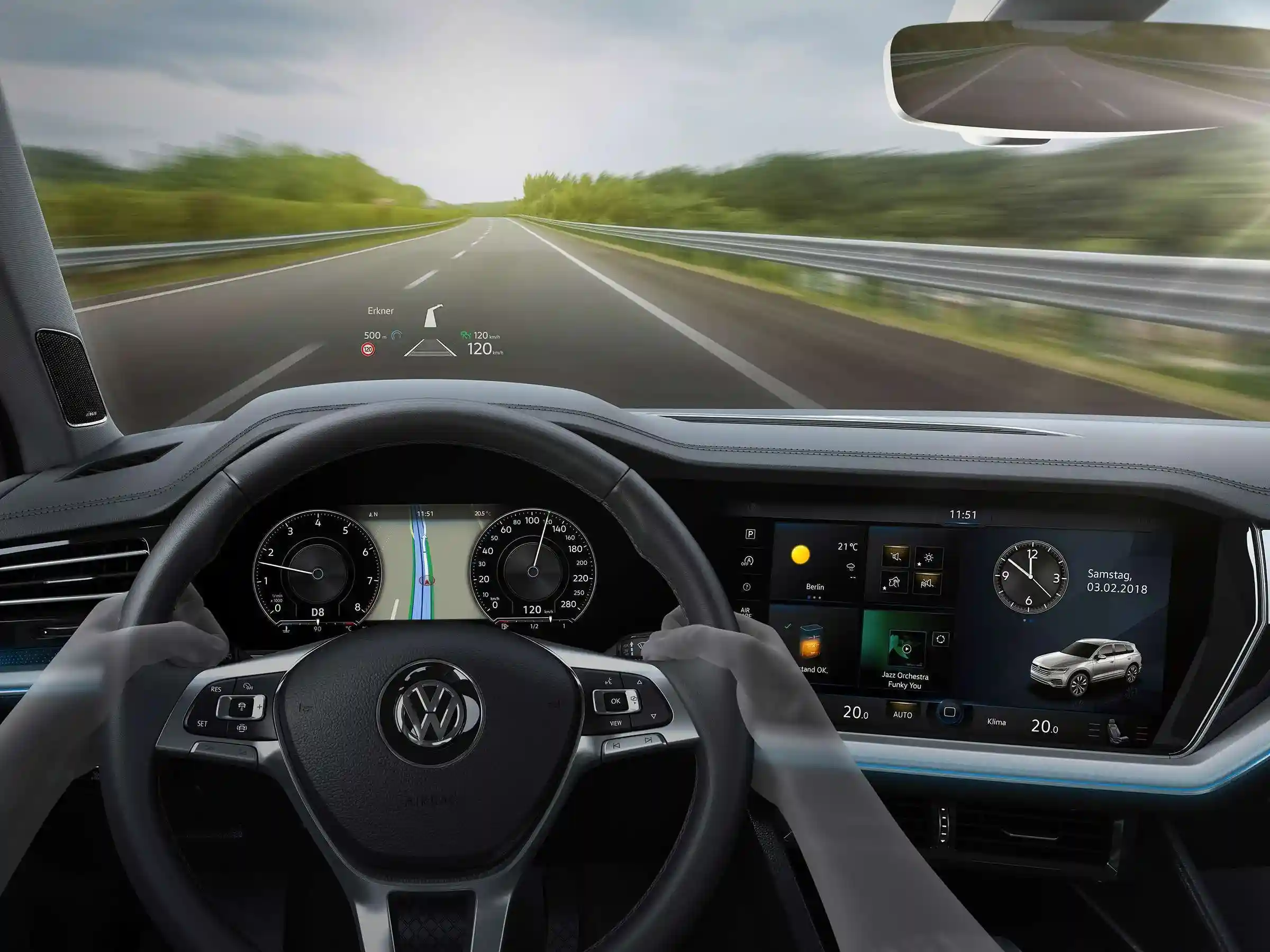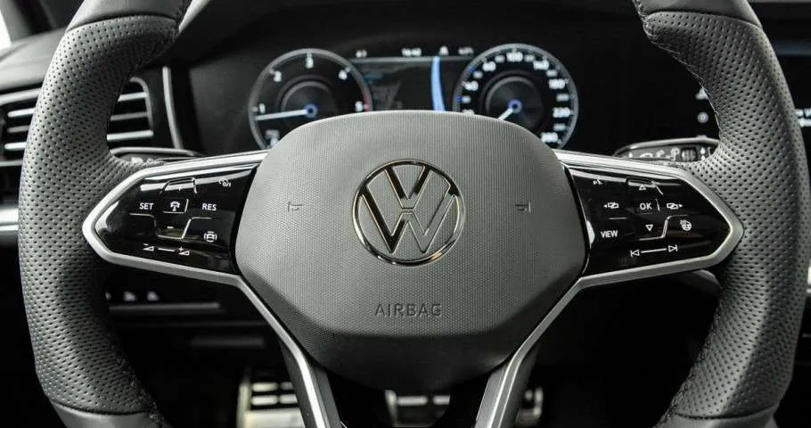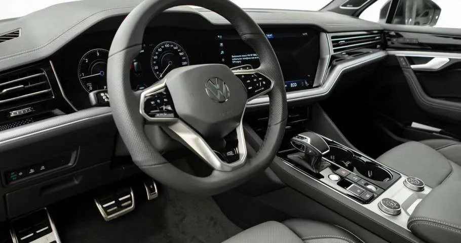 • Мультифункциональное рулевое колесо с кожаной отделкой, обогревом, подрулевыми переключателями и логотипом R-line